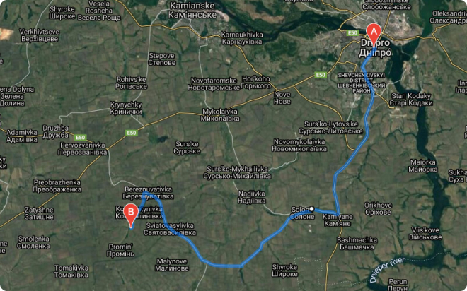 Цей маршрут трохи коротший. Протяжність траси з міста Дніпро до села Голубинівка складає 76,5 км, а час поїздки – 1 година 40 хвилин.
